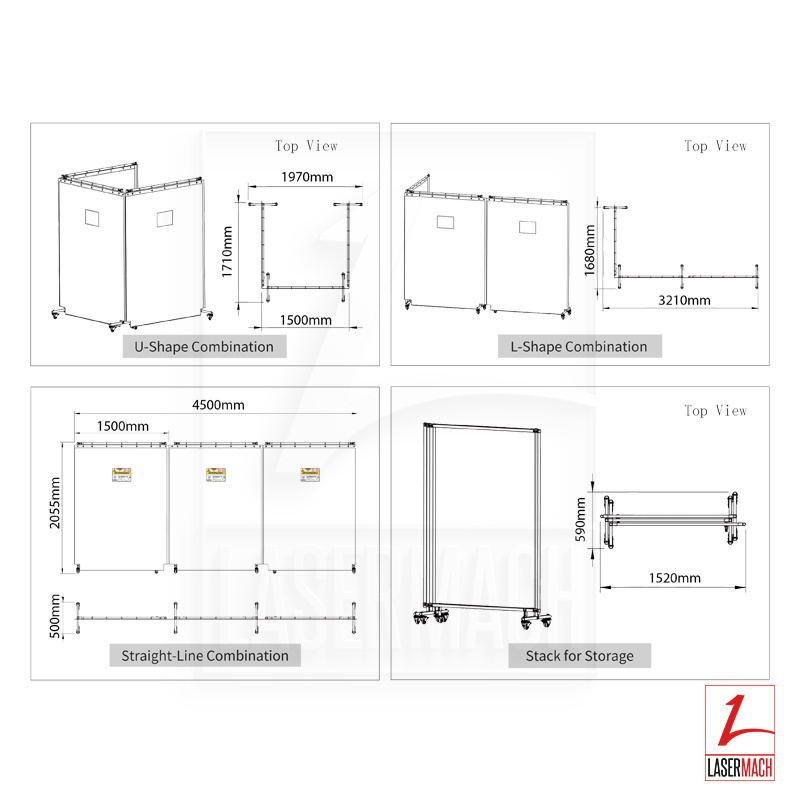 Laserové svařovací závěsy se dodávají v různých velikostech a konfiguracích, aby vyhovovaly různým pracovním prostorům a aplikacím. Lze je zavěsit na stropní kolejnice nebo namontovat na rámy a vytvořit tak ochrannou bariéru kolem laserové svařovací stanice.